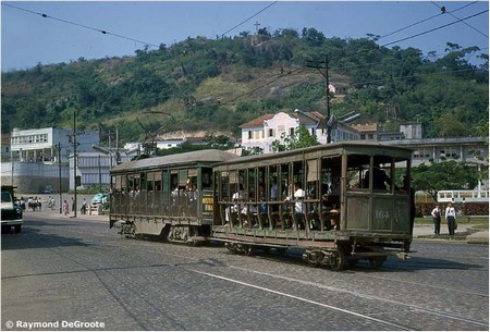Bonde 517 e trailer 164 no entroncamento São Gonçalo. As trilhas que entram na Rua Coronel Serrado quase não são visíveis sob a sombra à direita [Raymond DeGroote].